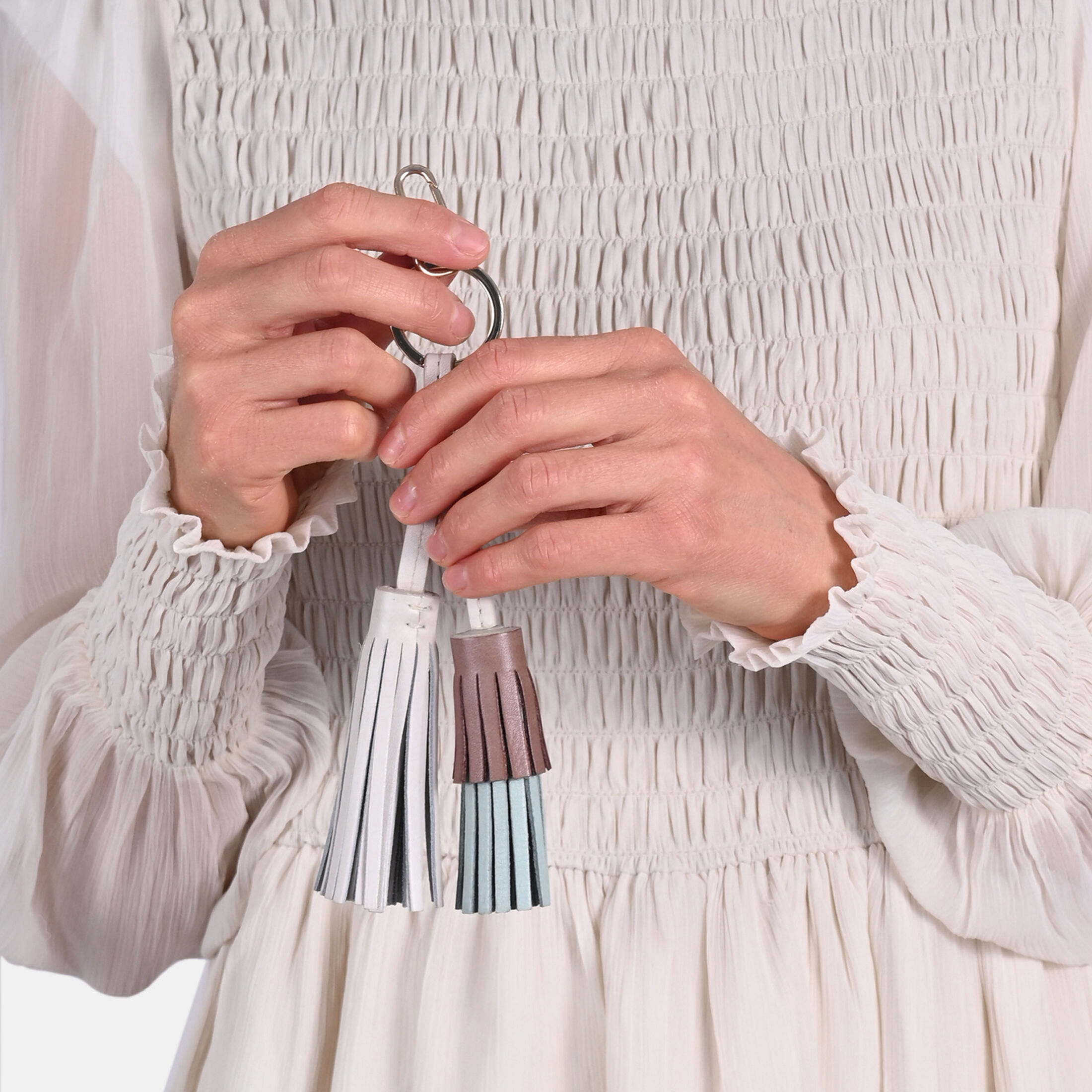 Schlüsselanhänger aus zwei Leder Quasten in Taupe, Mint und Sand