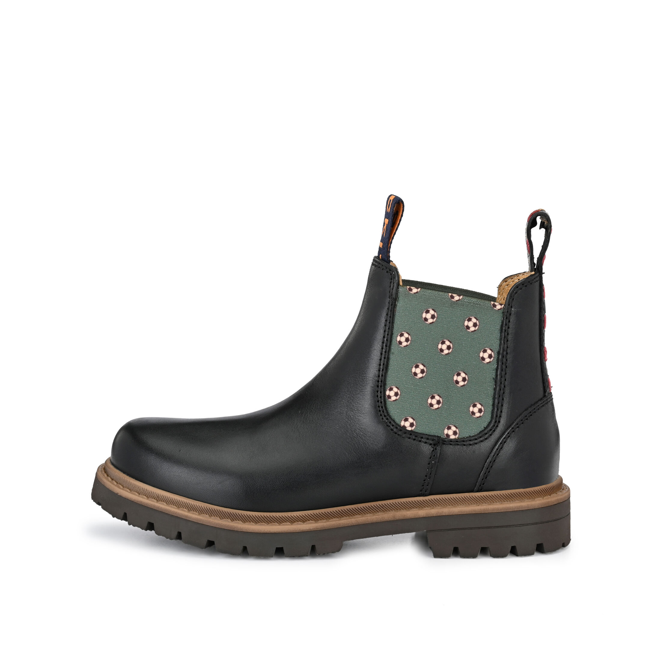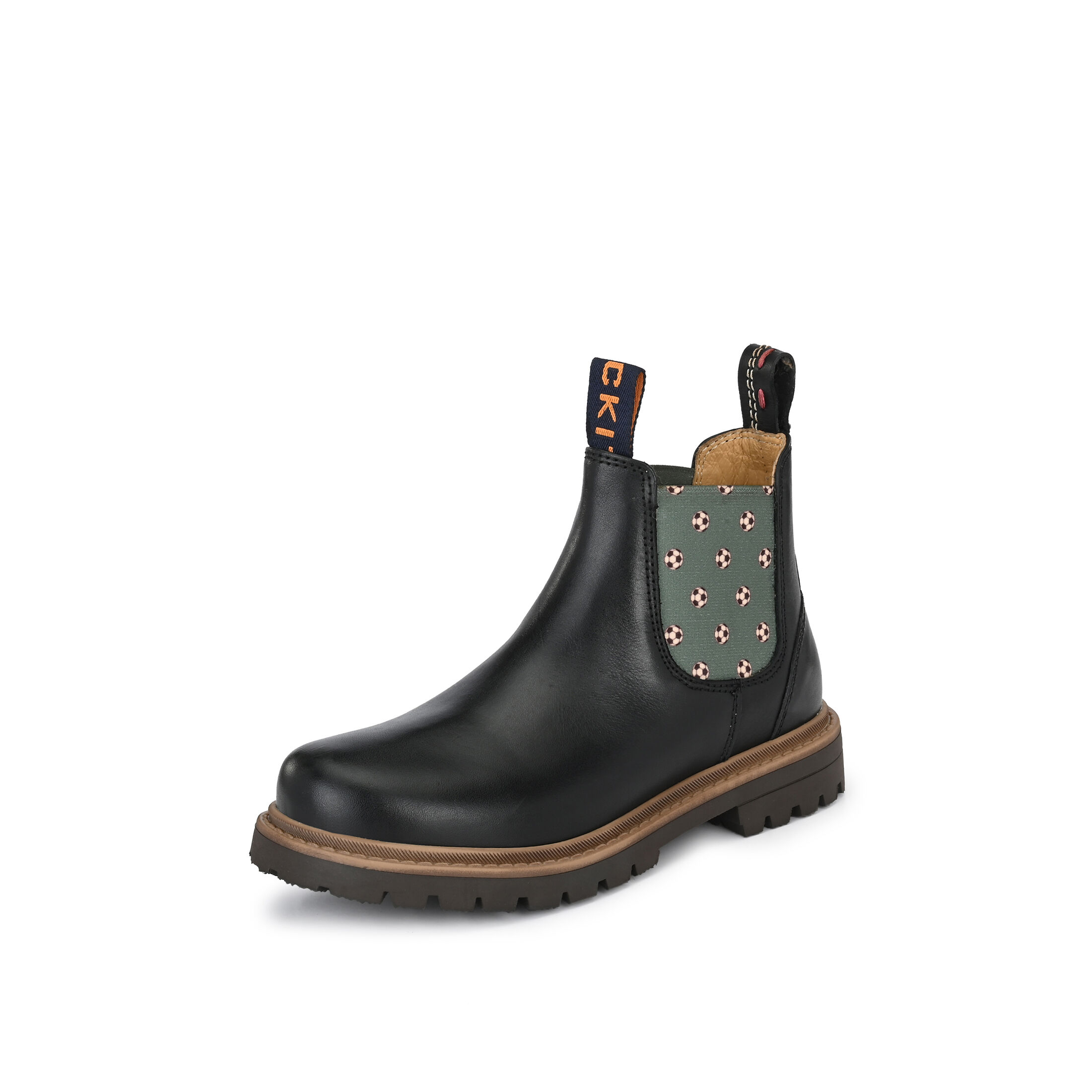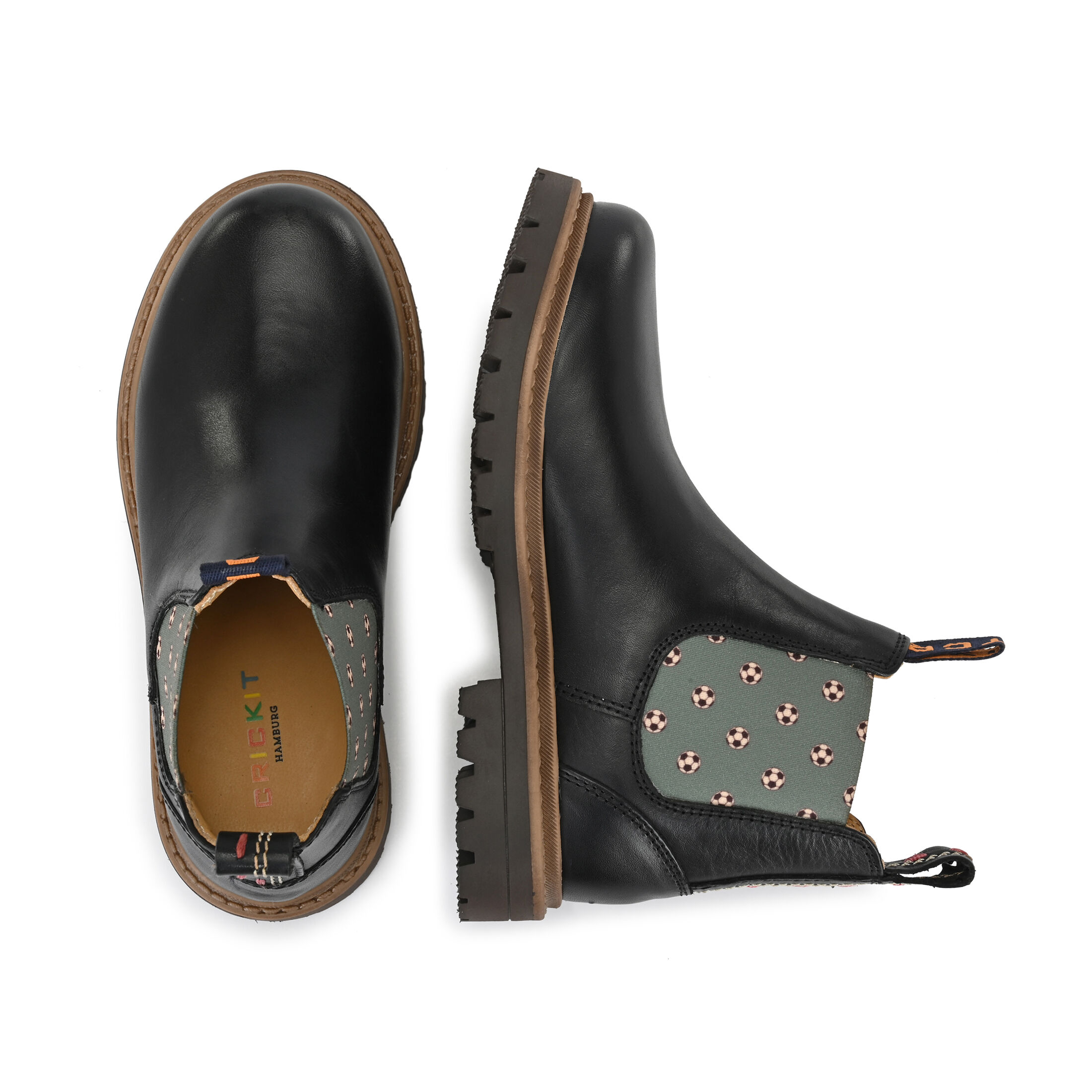 Liebevolles Design aus Hamburg - nun auch für die Kleinen! Unser klassischer Chelsea Boot RILEY ist nicht nur ein absoluter Hingucker dank den bedruckten Elastikeinsätzen in Mint mit Fussball Motiv, sondern auch super bequem und robust. Das pflegeleichte Obermaterial besteht aus pflanzlich gegerbtem Rindsleder in Schwarz. Die hochwertige Gummi-Profilsohle bietet festen Halt bei jedem Schritt. Das ist unverwechselbare CRICKIT-Qualität!