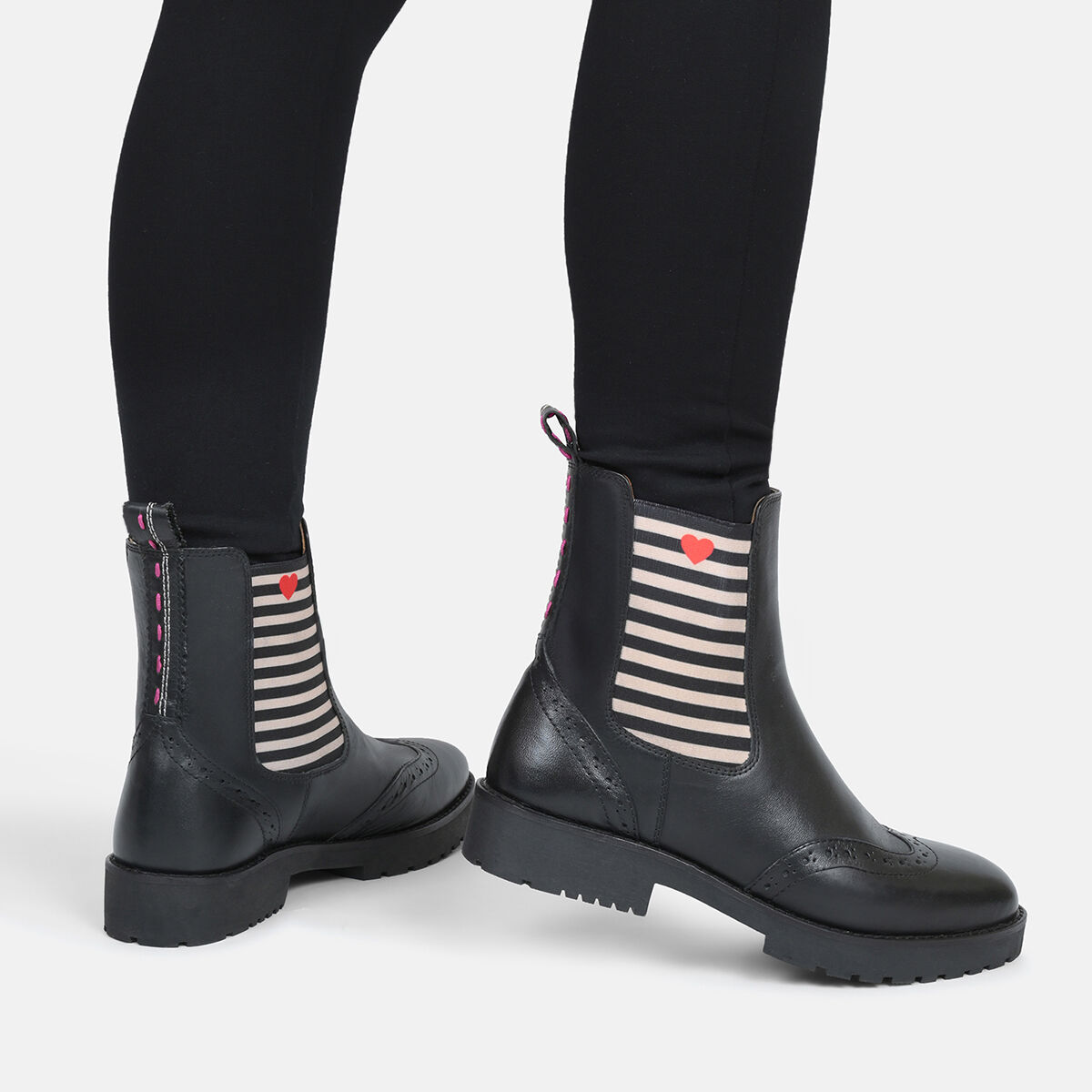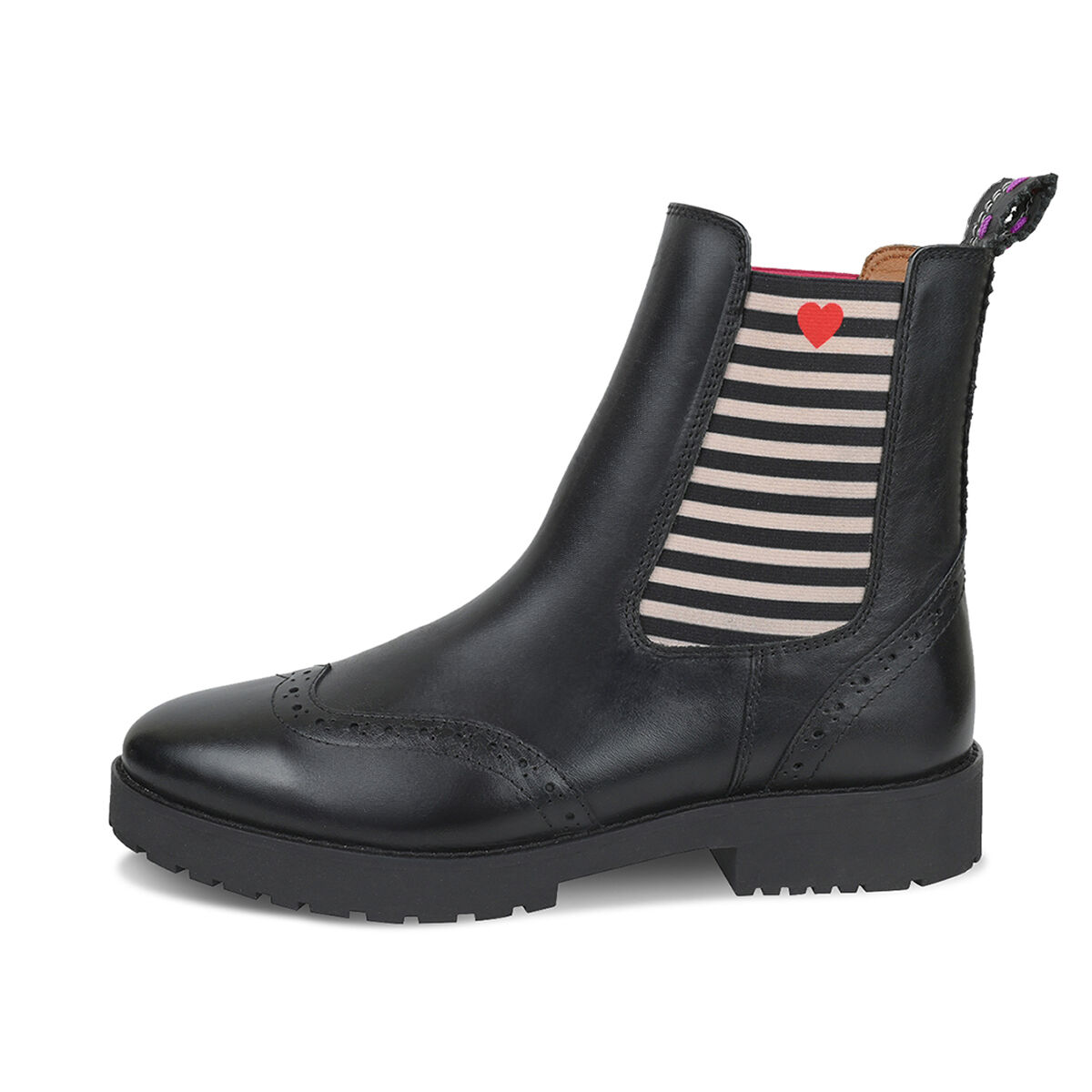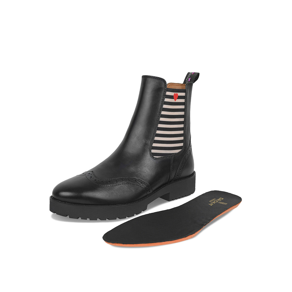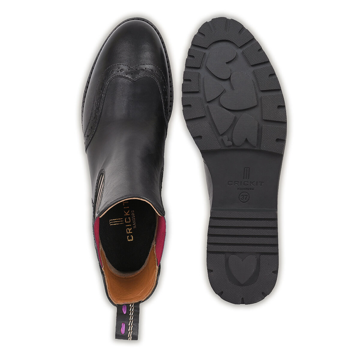 Die Stiefelette SERA kombiniert lässigen Stil mit eleganten Elementen. Das Obermaterial besteht aus pflegeleichtem Rindsleder in Schwarz und hochwertigem Innenfutter. Die Elastikeinsätze an der Seite mit Herzchen sorgen für einen besonders leichten Einstieg. Für ein angenehmes Tragegefühl sorgt das herausnehmbare Wechselfußbett, das zusätzlich maximale Flexibilität ermöglicht. Ein Element für alle Detail-Liebhaber: Die typische CRICKIT-Naht an der Ferse des Schuhs.