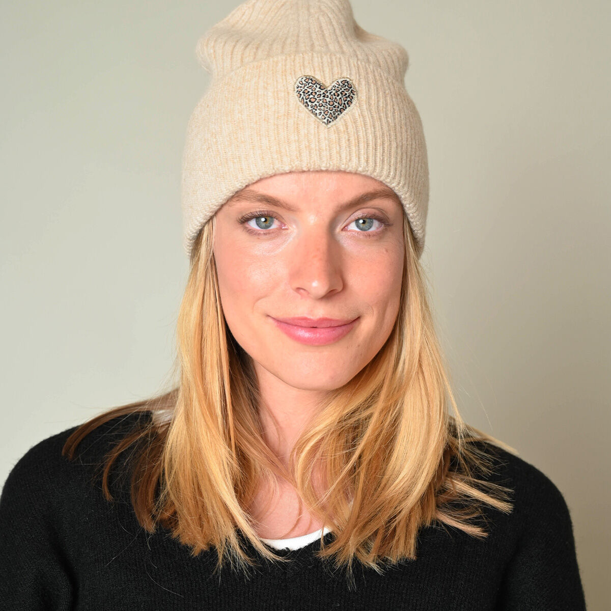 Kuschelige Beanie Mütze aus warmer Wolle in Beige mit Leo Herz