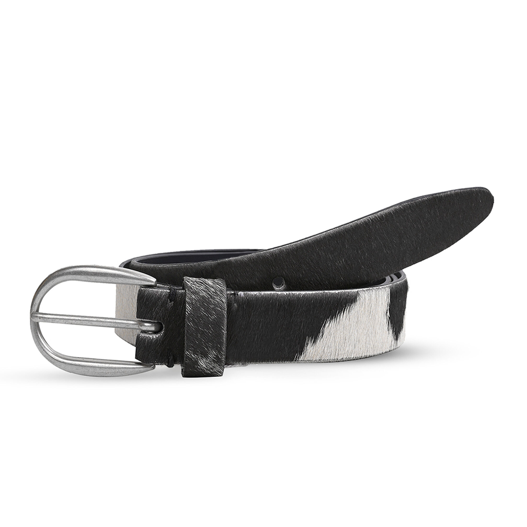 Fell Gürtel aus Leder im Kuh Design mit silberner Schnalle