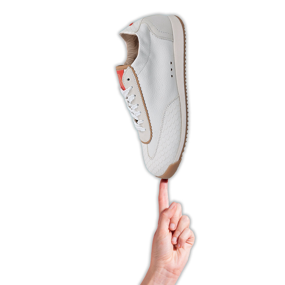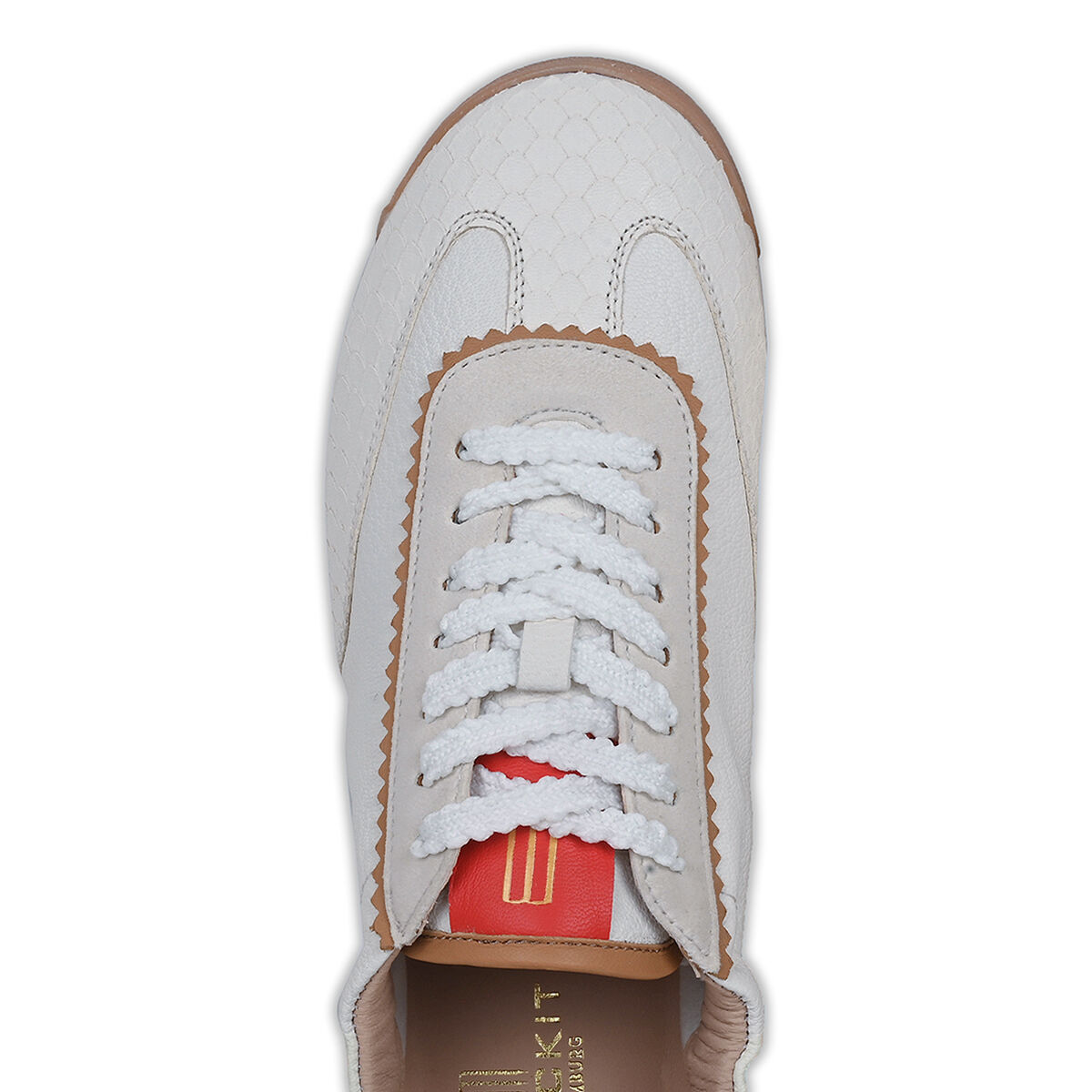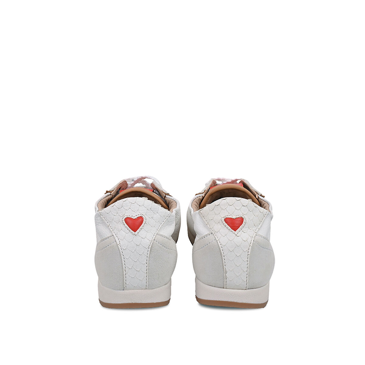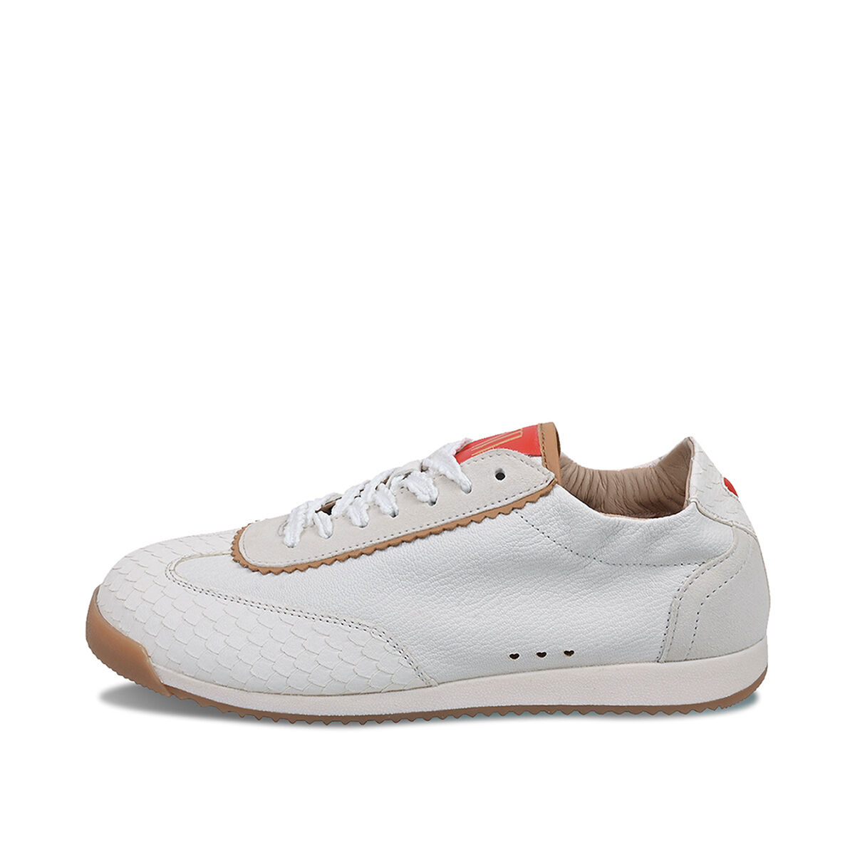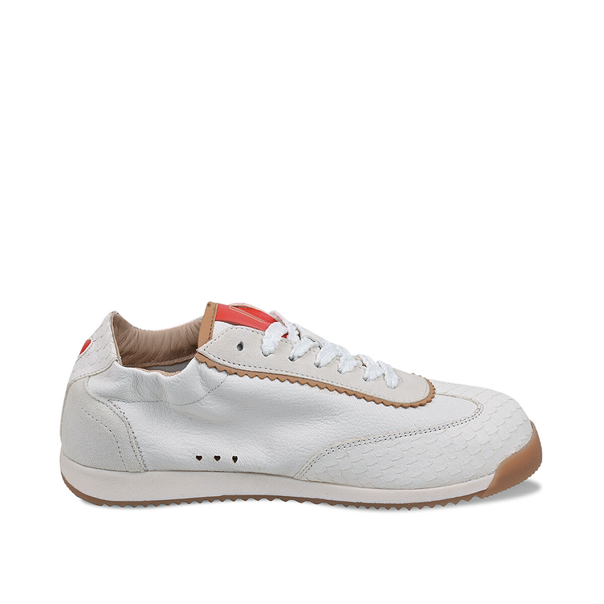 TARA überzeugt mit minimalistischem Retro-Charme. Die strukturierte und leichte Sohle sorgt für den nötigen Grip. Das softe Obermaterial des Sneakers ist aus weichem Ziegenleder und wird durch die weiße Farbe mit roten Elementen und Schlangenprint zum absoluten Hingucker! Ein Sneaker in Ballerina-Optik. Feminin und sportiv zugleich. Ein herausnehmbares Wechselfußbett schafft zusätzliche Flexibilität, etwa für eigene Einlagen oder individuellen Tragekomfort. Besondere Designelemente wie die kleine Herzaustanzung und der umstickte Schnürsenkel machen den Sneaker einzigartig!